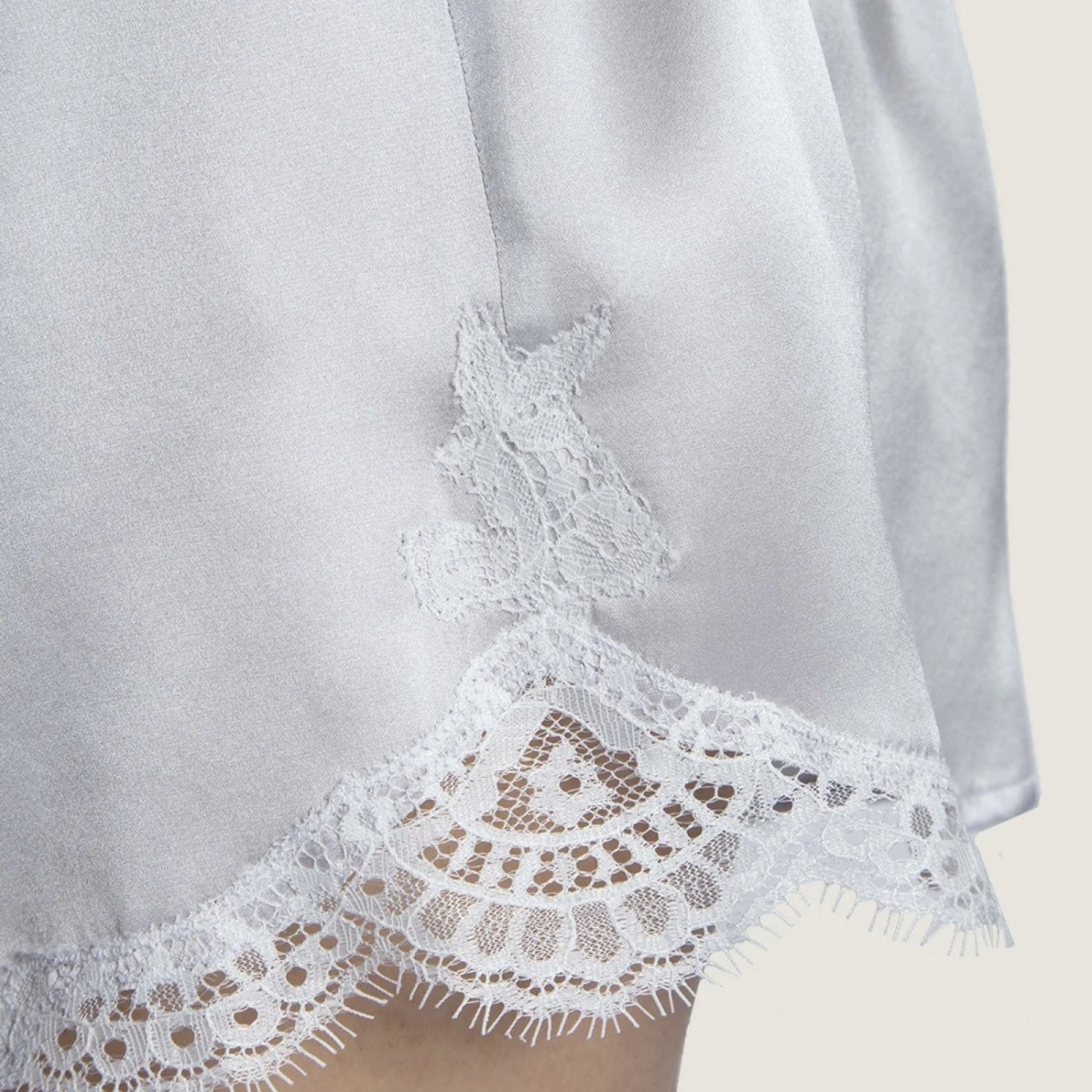 Un coloris Rêve d’Opale une soie propice à l’imaginaire mixée à une dentelle blanche.
