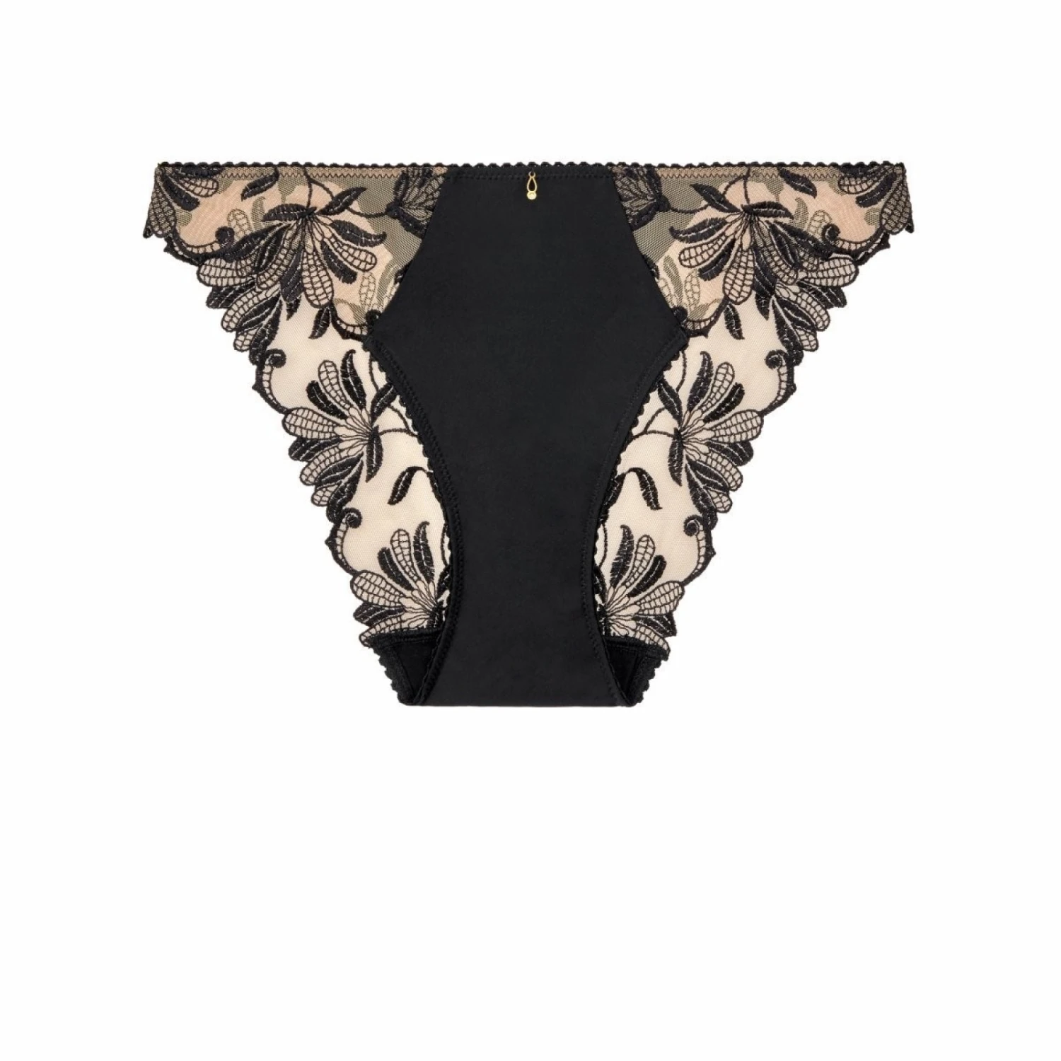 Ce slip Italien sexy de la ligne Lovessence présente un bijou en Zamac doré sur le devant ainsi qu’un noeud pompon fabriqué à la main derrière. Galons brodée Lycra® et rigide sur un tulle recyclé.