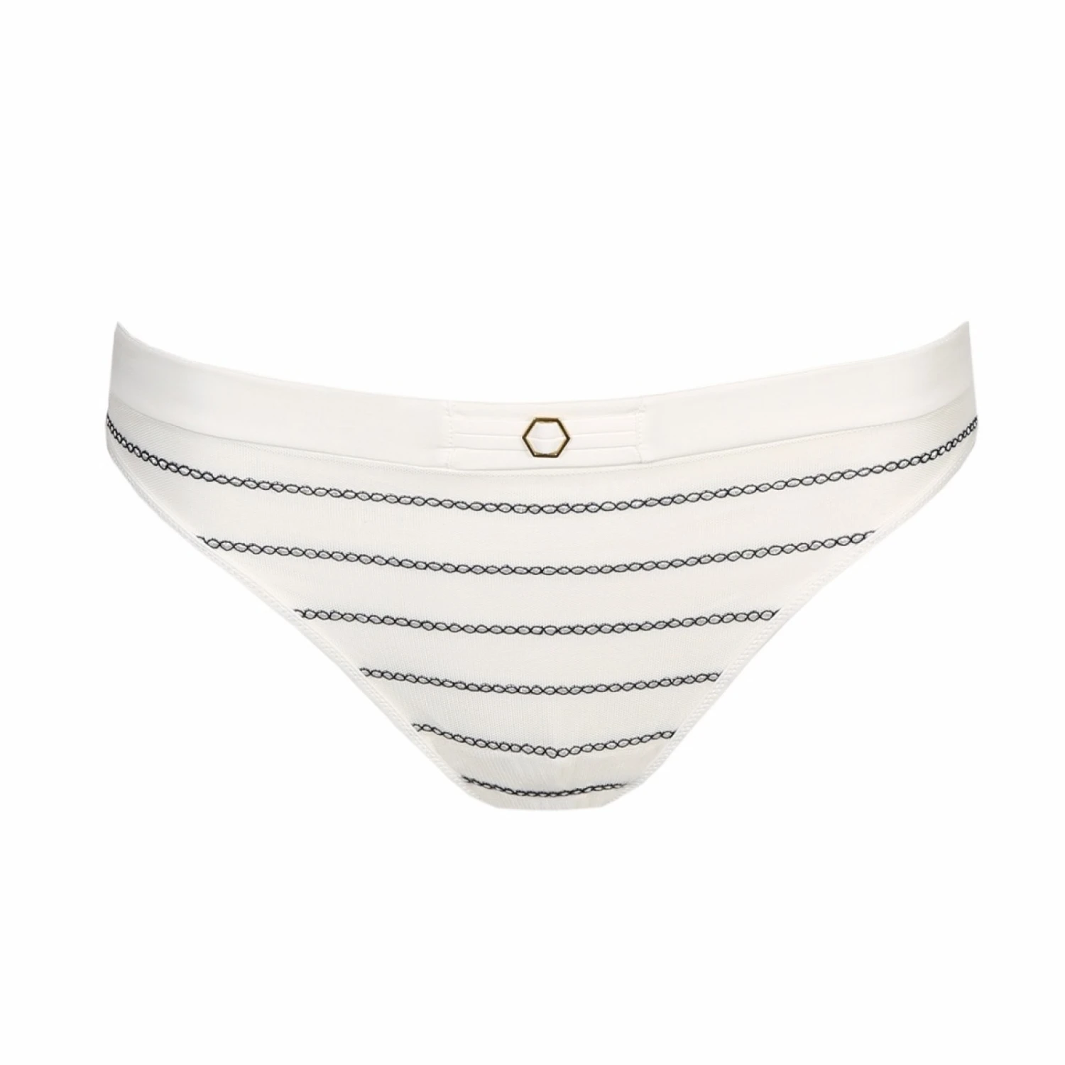 Un slip brésilien orné d’un petit bijou hexagonal à la taille. Doublure en maille douce à l’avant, douce et extensible à l’arrière.