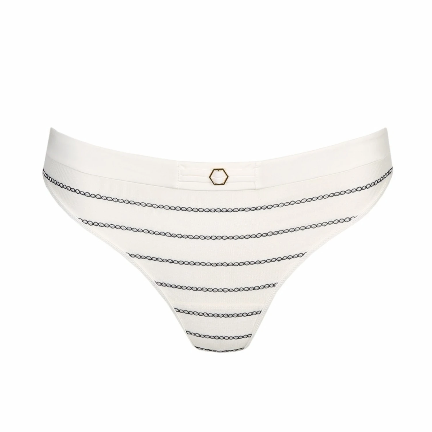 Un string orné d’un petit bijou hexagonal à la taille. Doublure en maille douce à l’avant, douce et extensible à l’arrière.
