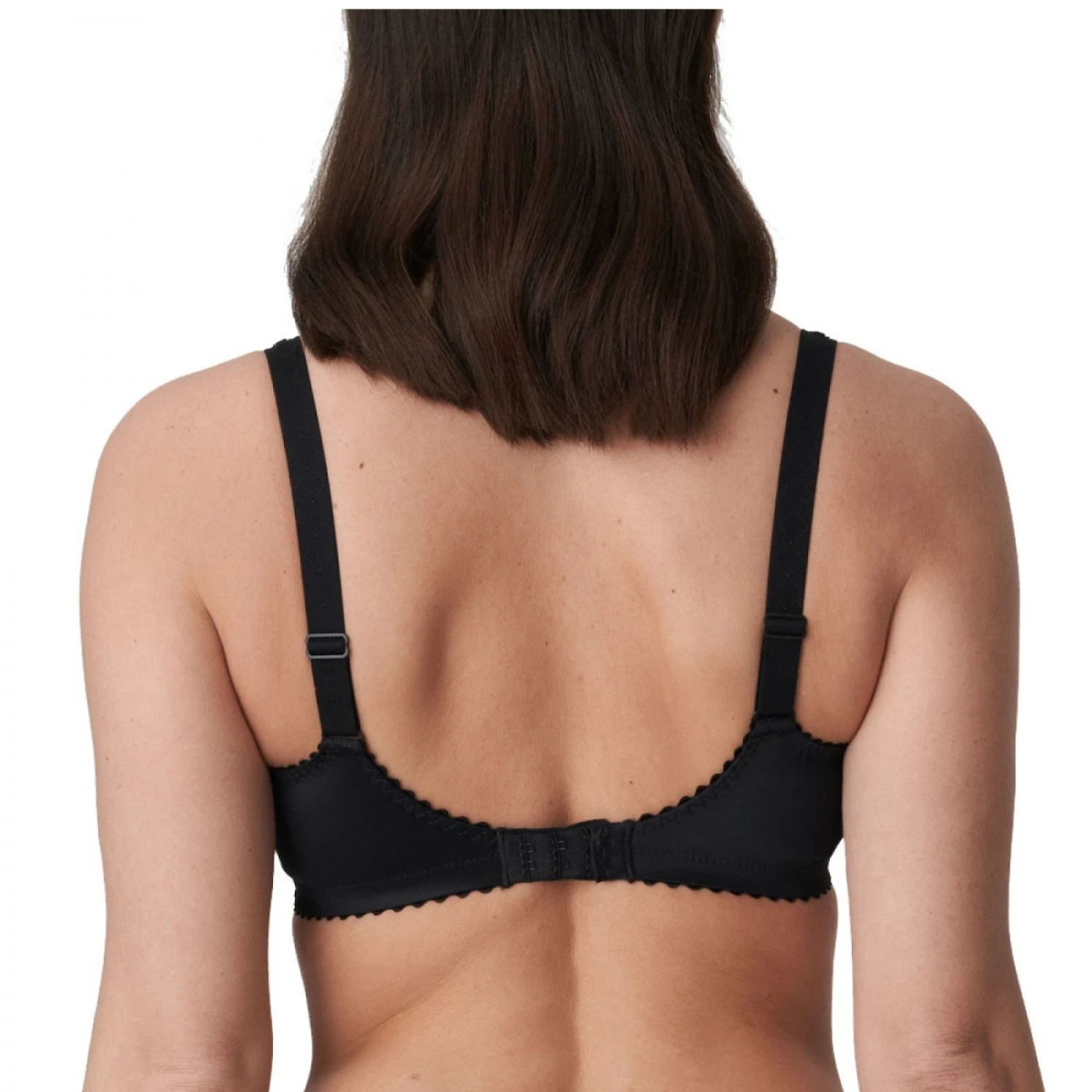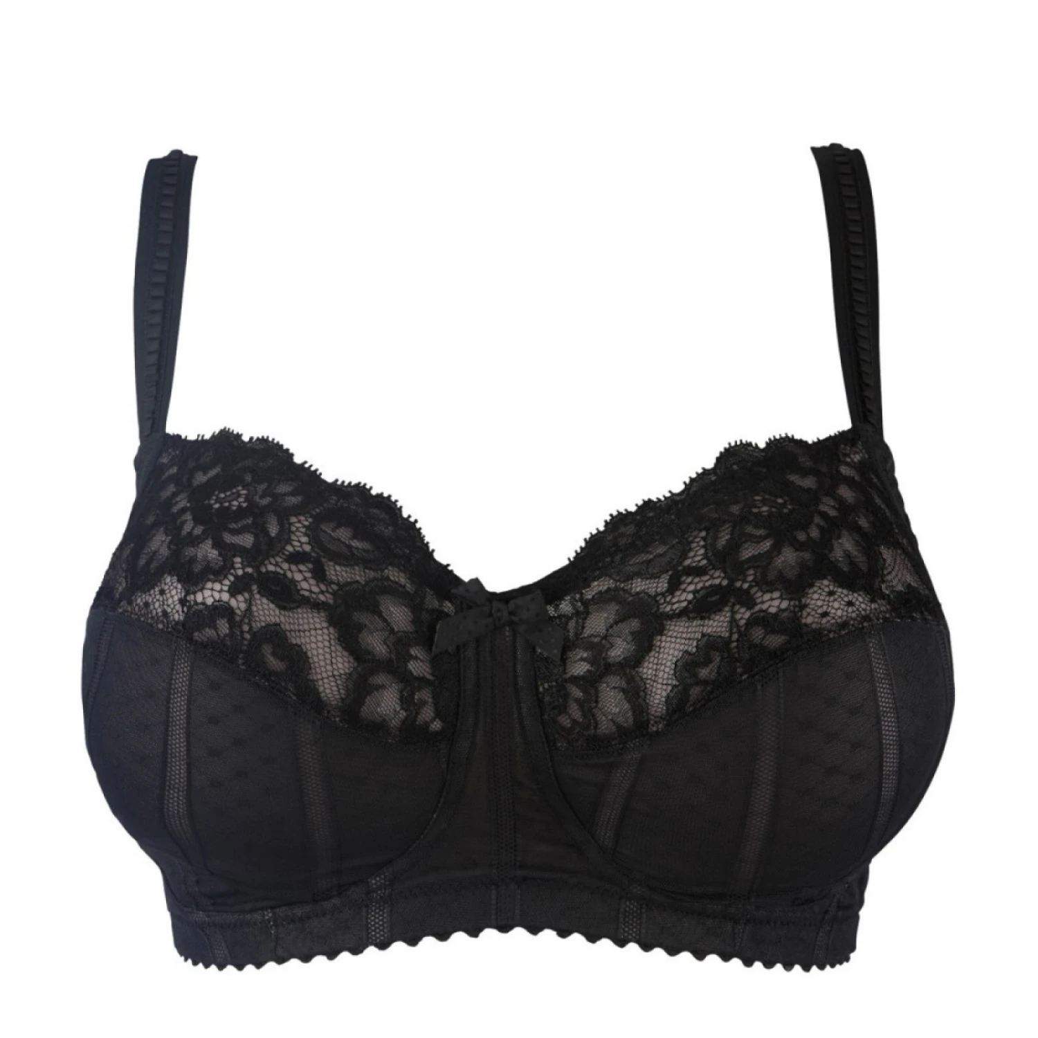 Ce nouveau modèle sans armatures offre soutien et confort aux poitrines rondes. Le bas du bonnet est réalisé en tulle structuré au motif corseterie. Le haut du bonnet en dentelle élastique crée un décolleté féminin. La bretelle est ornée d’un fin ruban piqué. Le Noir est et reste un grand classique, sexy et intemporel.