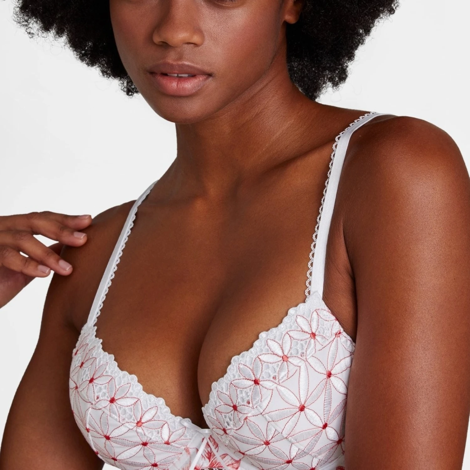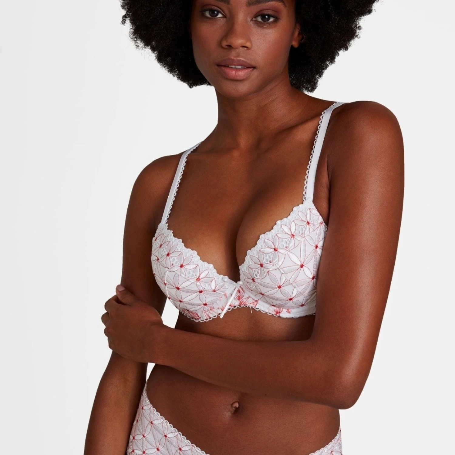 Un soutien-gorge Plunge qui réhausse la poitrine avec des coussinets amovibles jusqu’au bonnet C ( à partir du bonnet D le bonnet est coqué)
