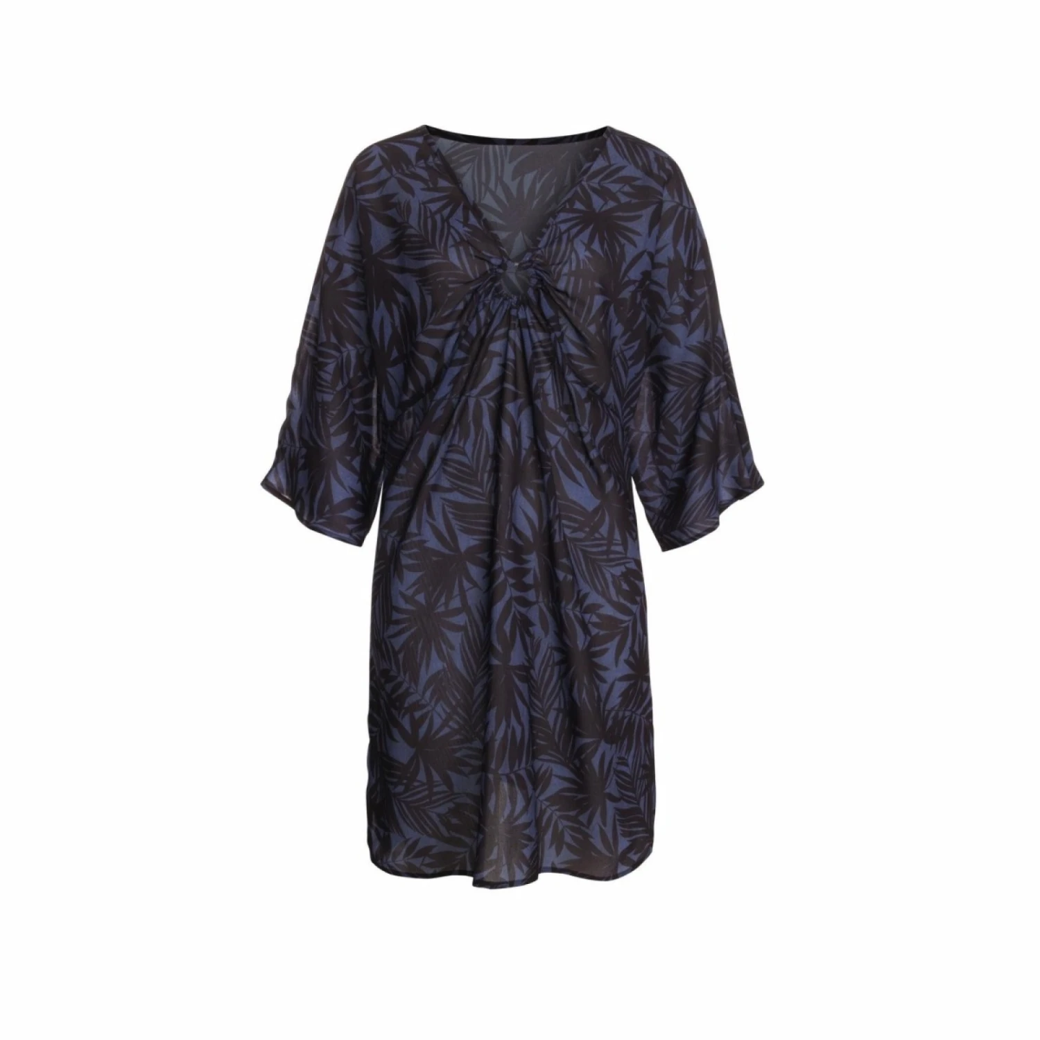 Le compagnon parfait pour une soirée sur la plage ! La tunique Sydney est particulièrement tendance et très élégante avec son imprimé de palmiers noir sur une structure de denim foncé. Avec sa coupe en A, ses manches ¾ transparentes et ses finesfronces au centre, cet accessoire de plage opaque met habilement en scène la silhouette féminine.